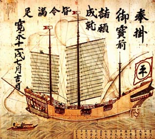 "A ship! But what kind?" his eyes were bright as they focused on the vessel anchored in their bay. Pam carefully grasped the black neoprene strap at her neck to pull her precious birding scope out of its chest pocket home. She cupped a palm over the outer lens to prevent any reflection from the bright southern sun giving away their position. Focusing in she was surprised to see a brightly painted vessel with elegantly carved touches to its woodwork: dragons and sea turtles and cranes. The back and front were both set high and the sails were an odd squared-off shape.