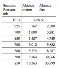 As you go higher, air temperature and pressure drop, at least until you reach 11 km. Upper air weather maps often are identified in terms of the standard pressure at the height the measurements were made, rather than the height (above sea level) directly. Note that one millibar (mb) equals 100 pascals. The weather maps most often available are for the "pressure altitudes" shown below: